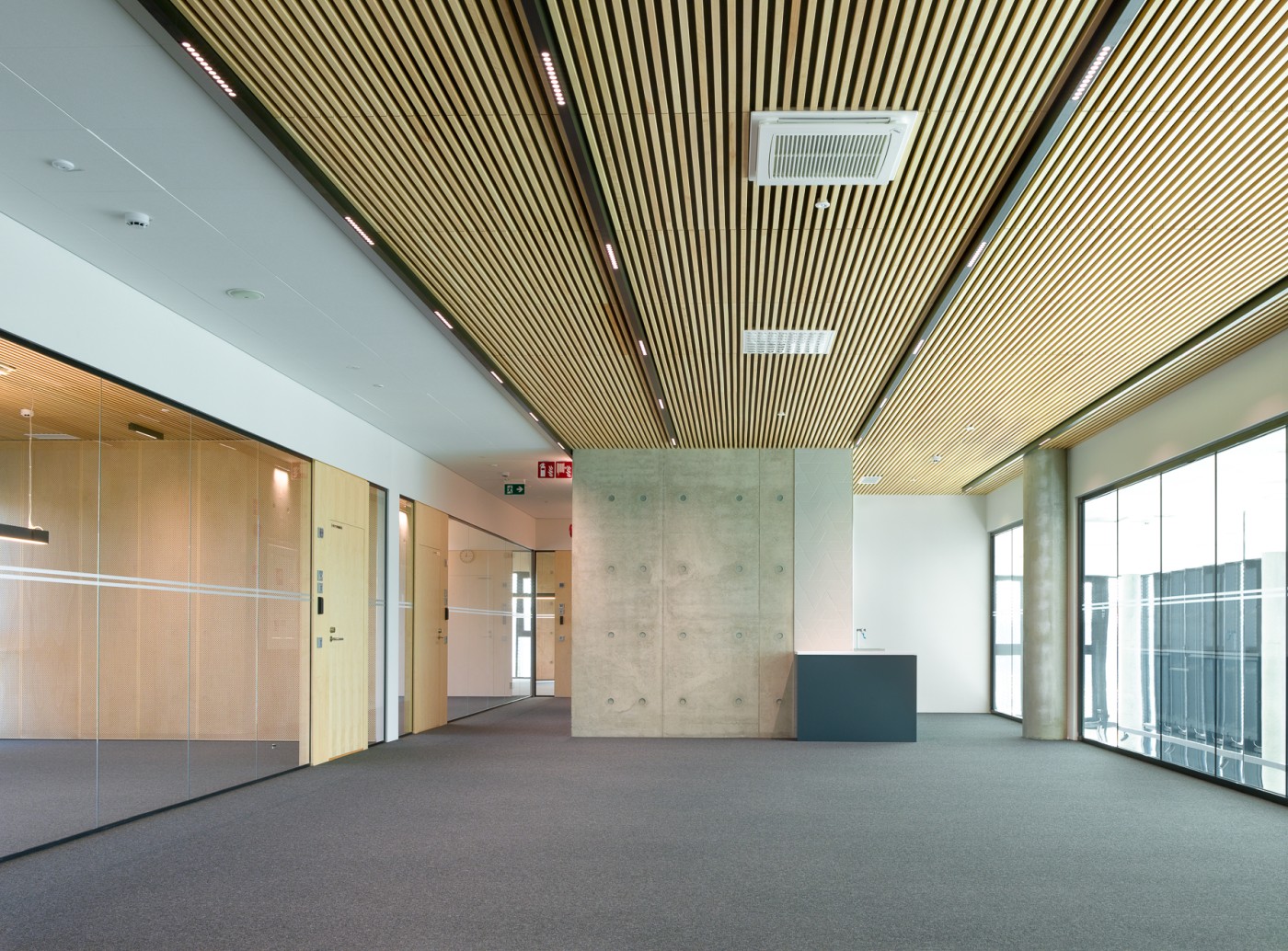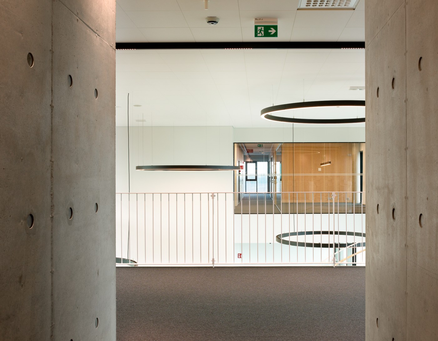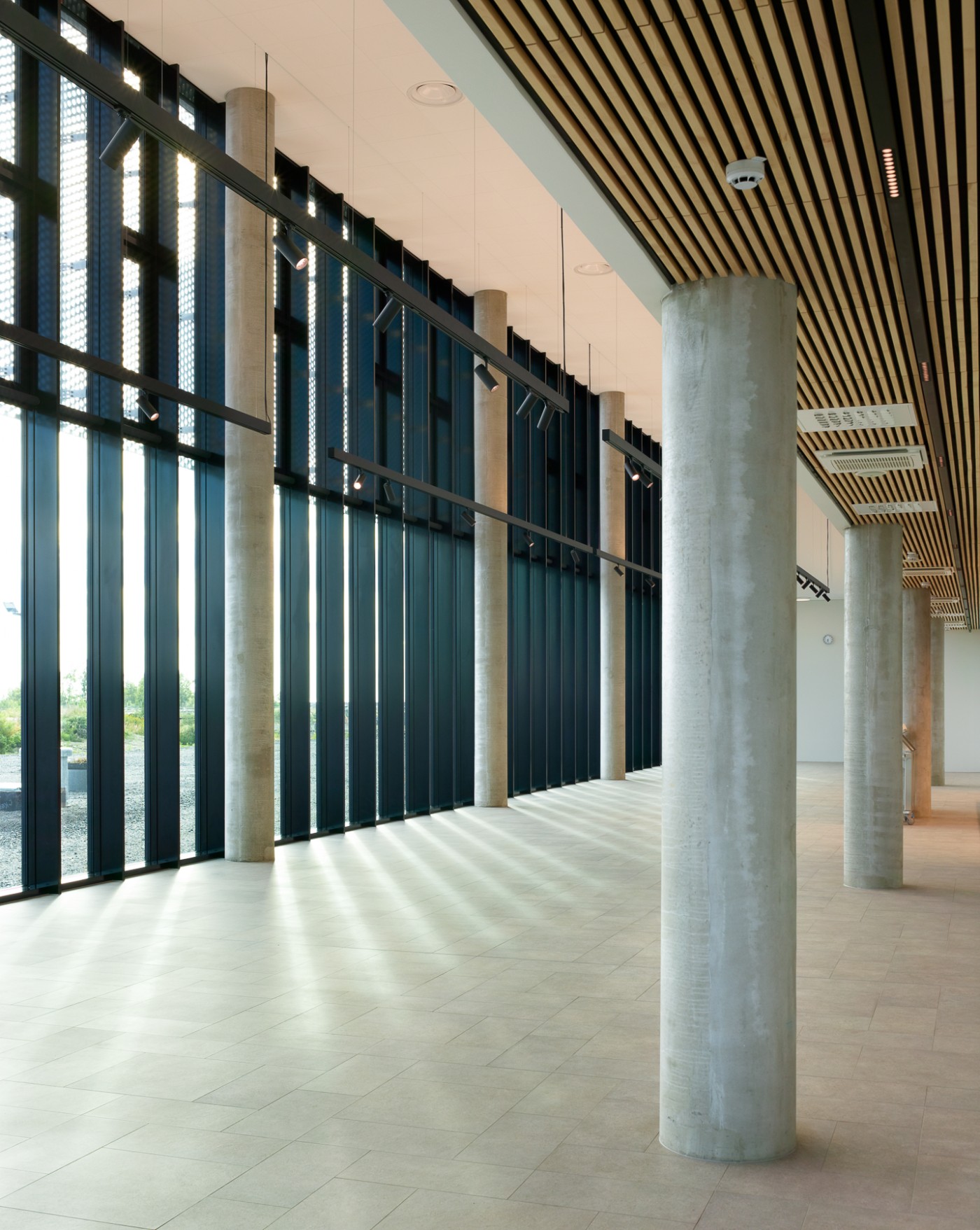 The interiors are bright and spacious. Glass partitions provide views through the building and rooms. The concrete frame is mainly left exposed in the interior. Light wood surfaces are used in many spaces as a softening contrast to the high quality but rough concrete surfaces.