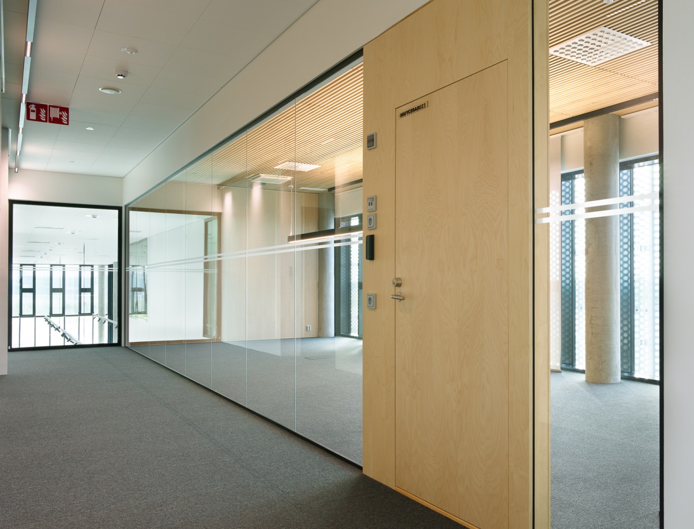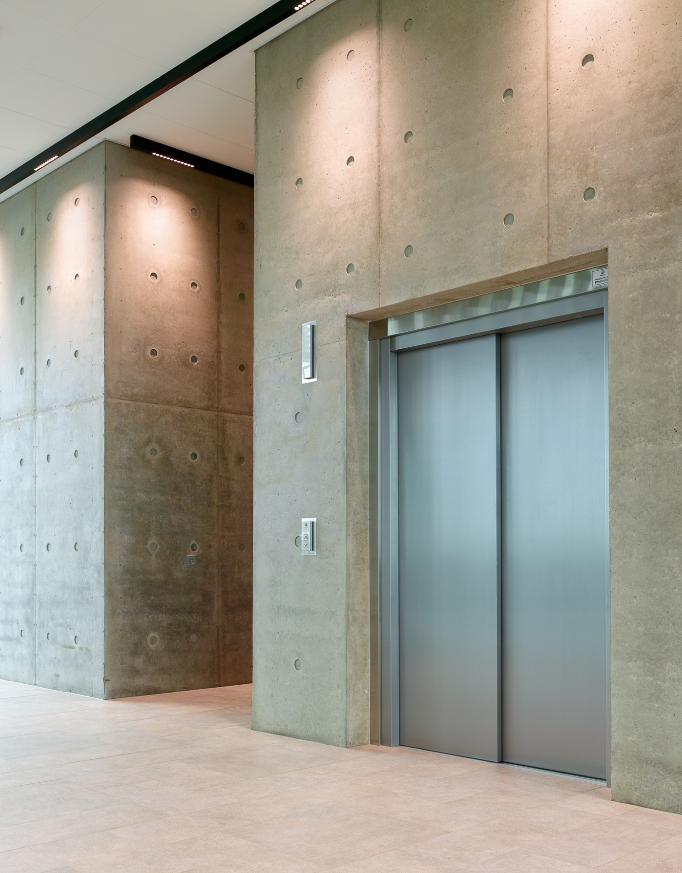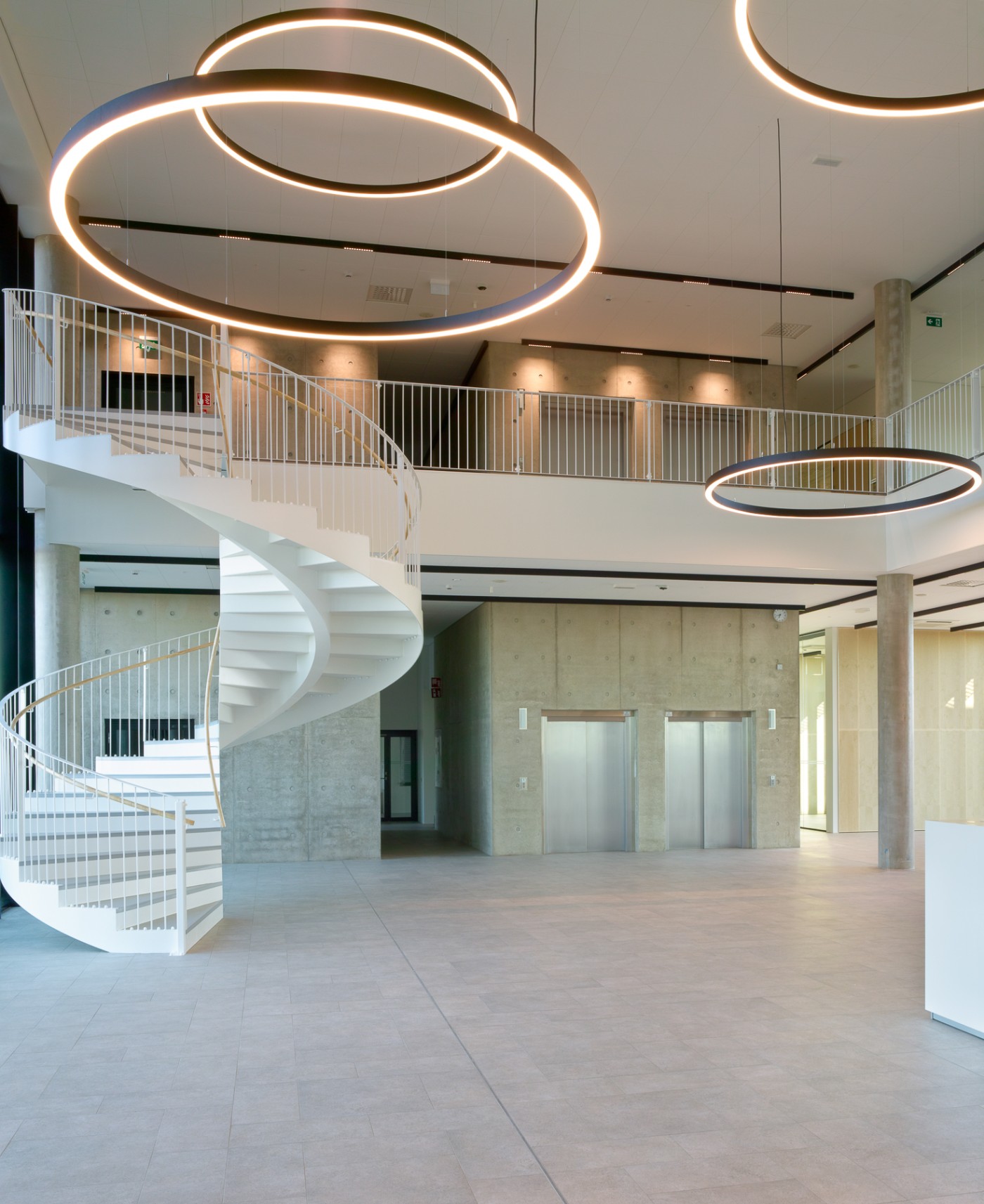 The interiors are bright and spacious. Glass partitions provide views through the building and rooms. The concrete frame is mainly left exposed in the interior. Light wood surfaces are used in many spaces as a softening contrast to the high quality but rough concrete surfaces.