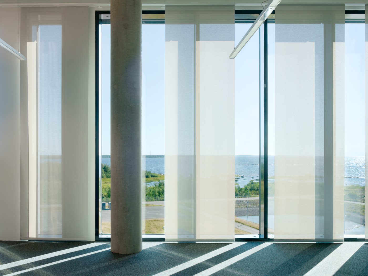 The location of the building was determined by the site layout of the nuclear power plant complex. The first floor of the administration building and the basement contain common areas. On the first floor is a canteen for 240 people and a preparation kitchen serving it. The upper office floors are divided into a peripheral zone for serviced work areas and a central zone for serving spaces such as stairwells and lift shafts. Workspaces consist of a combination of open-plan office spaces and office rooms. The office floors offer views of the surrounding seascape.