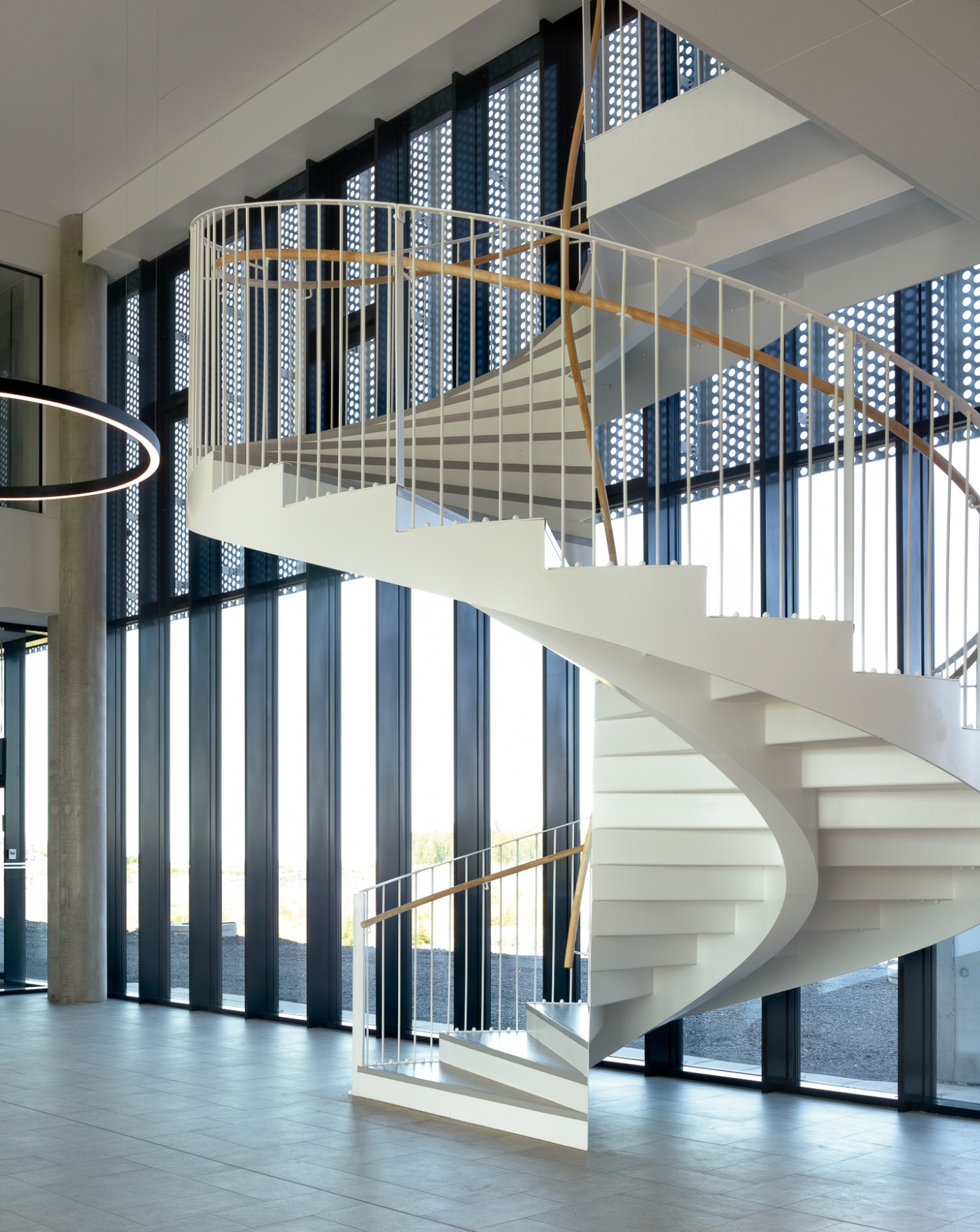 The exterior walls consist of prefabricated elements with light grey aluminium cladding. The gable ends of the building and the second floor are clad in perforated sheeting. The alternating rhythm of the windows on the upper office floors reduces the scale of the building and adds variety to the facades.