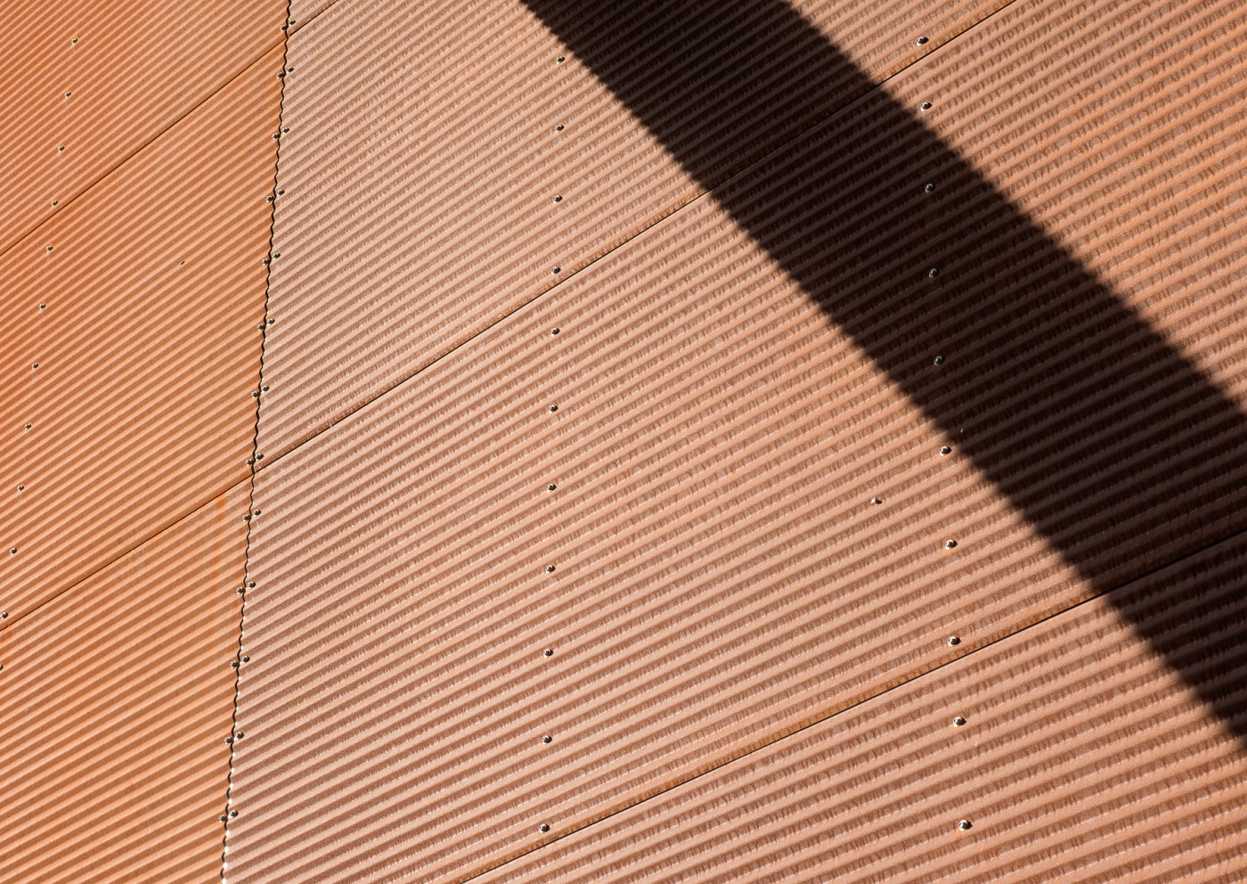 The turbine building has a concrete frame, and the other buildings are mainly steel. The facades of the buildings are mostly made of metal sandwich panels. Rust-coloured weathering steel accents the facades of stair towers and fuel handling buildings facing a busy road on the North side of the power plant site.