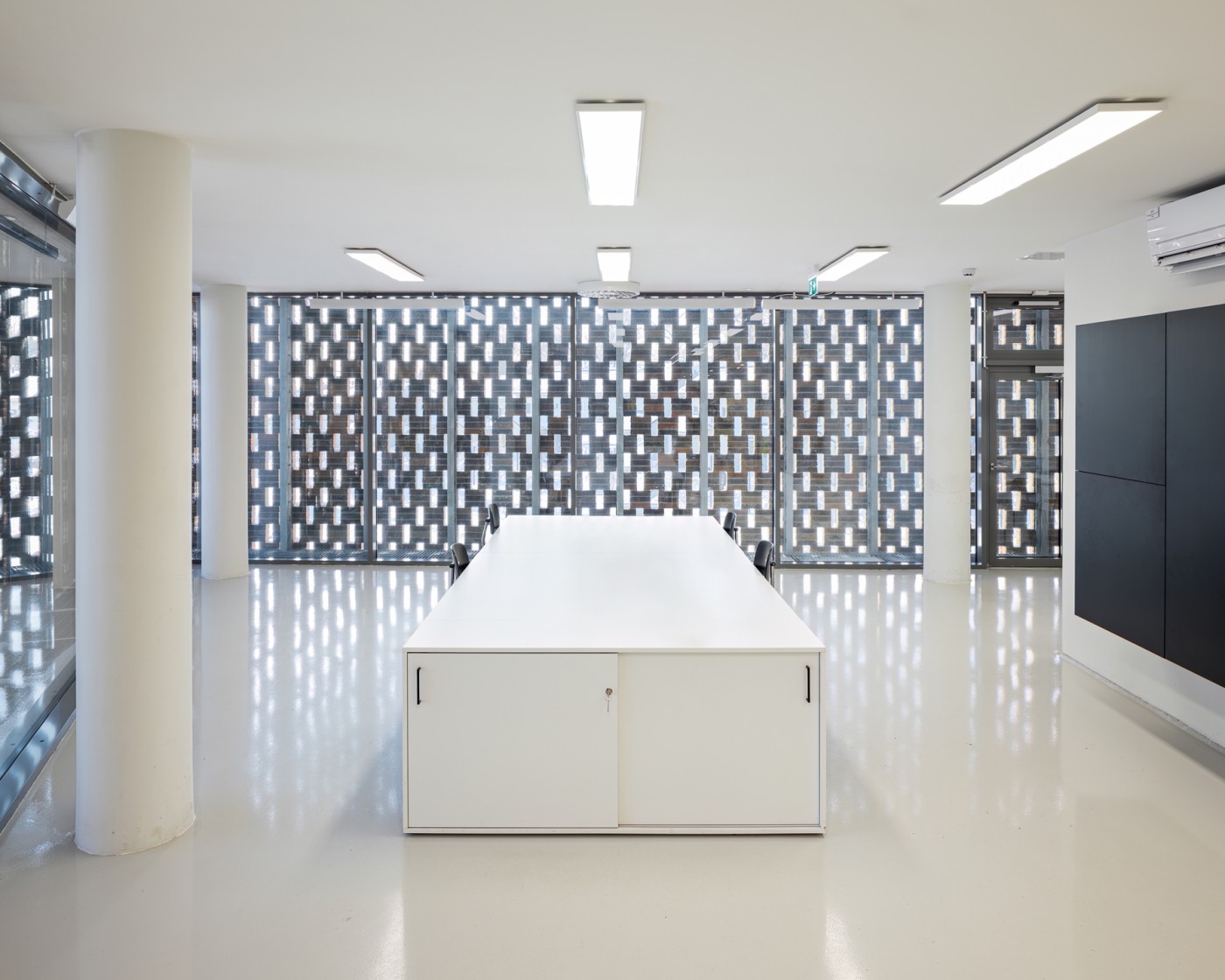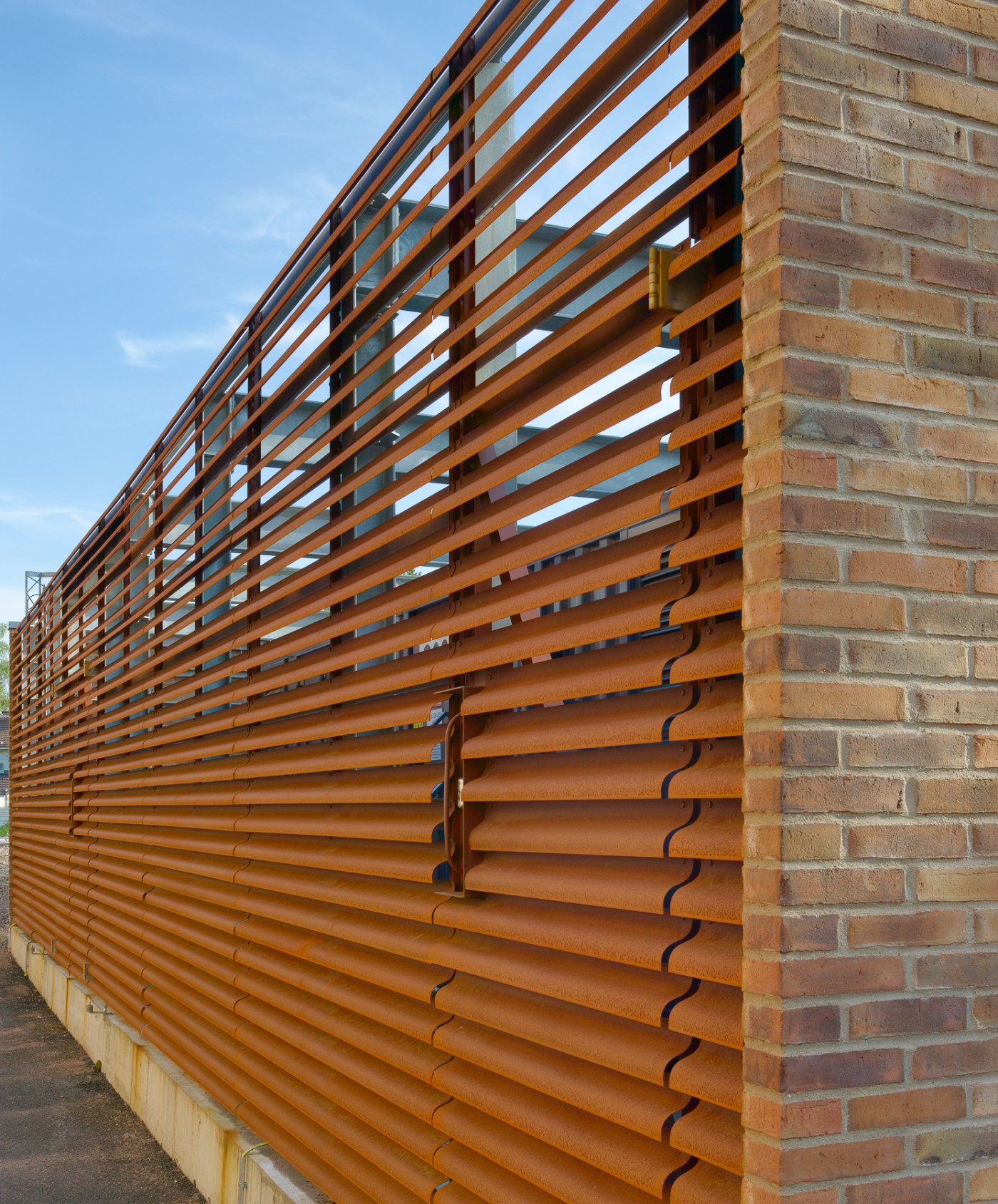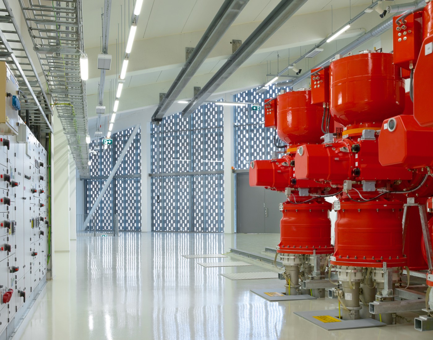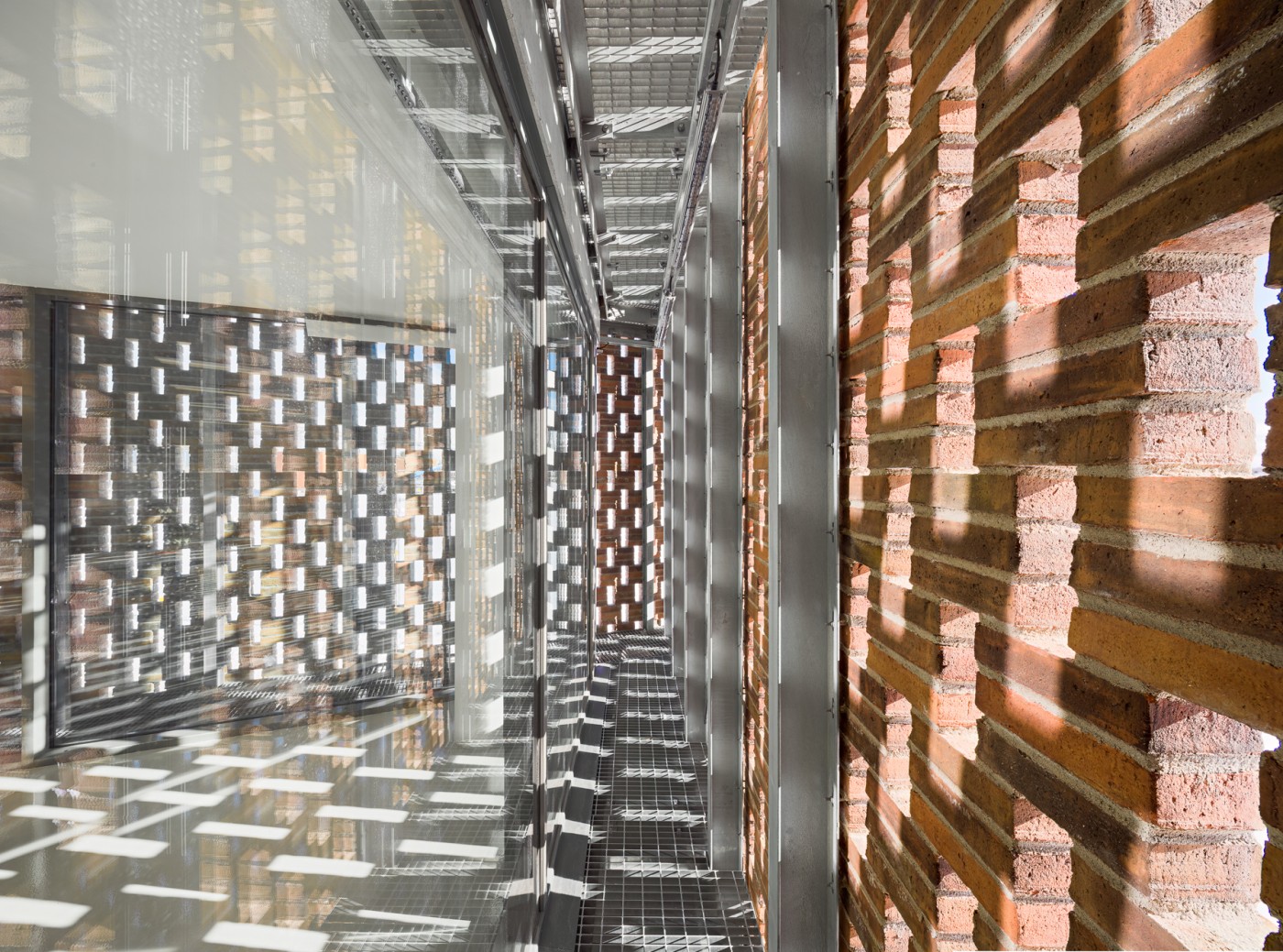 The switchgear building's brick cladding uses four masonry patterns, some laid as double-skin structures. The facades serve the interior spaces and allow light and air to pass through the double skin's porous latticework masonry where necessary. Successfully detailing the façades required 13 different types of custom-made bricks. On the double façade sections, the brick cladding is one metre away from the back wall, which is either glass or concrete.