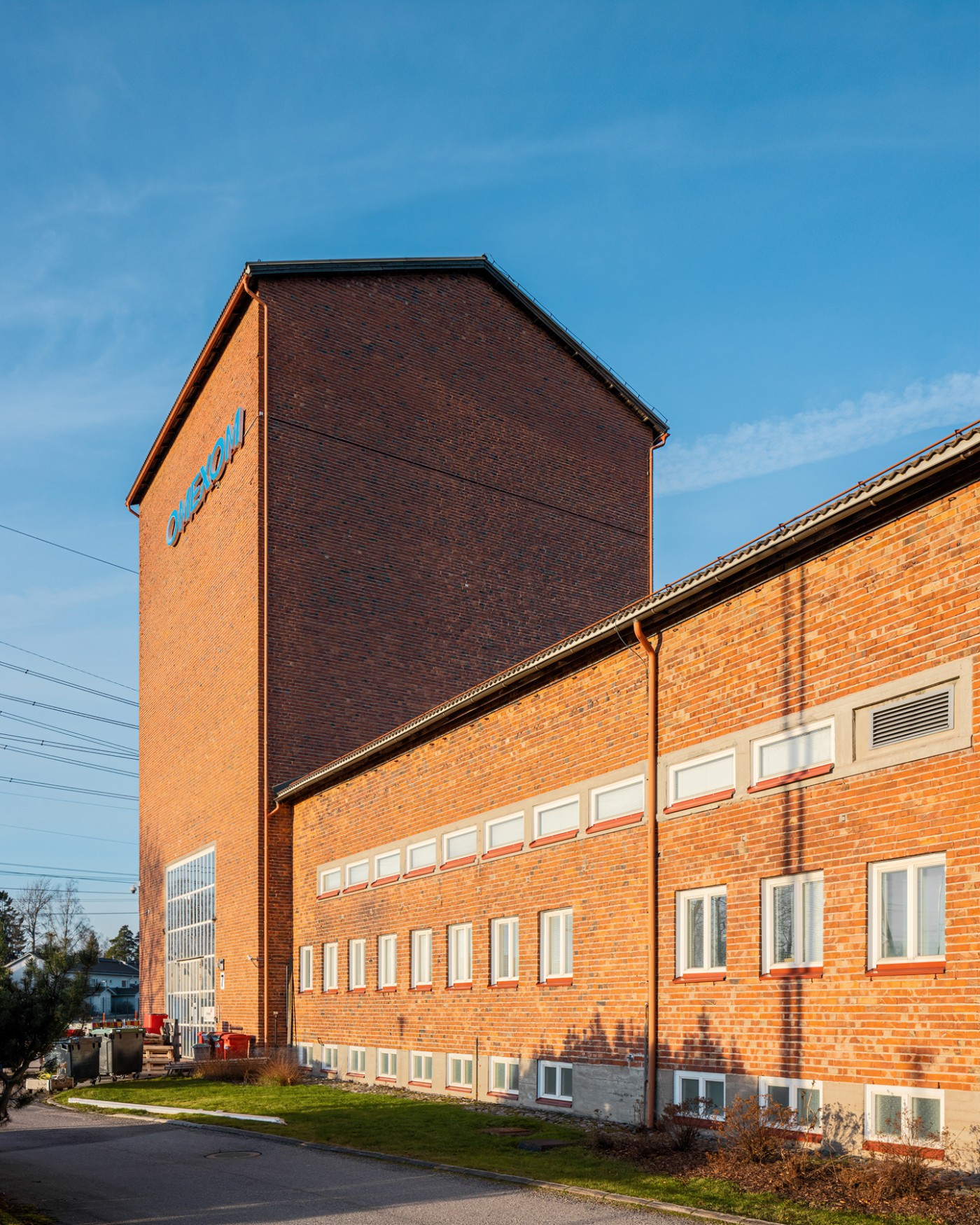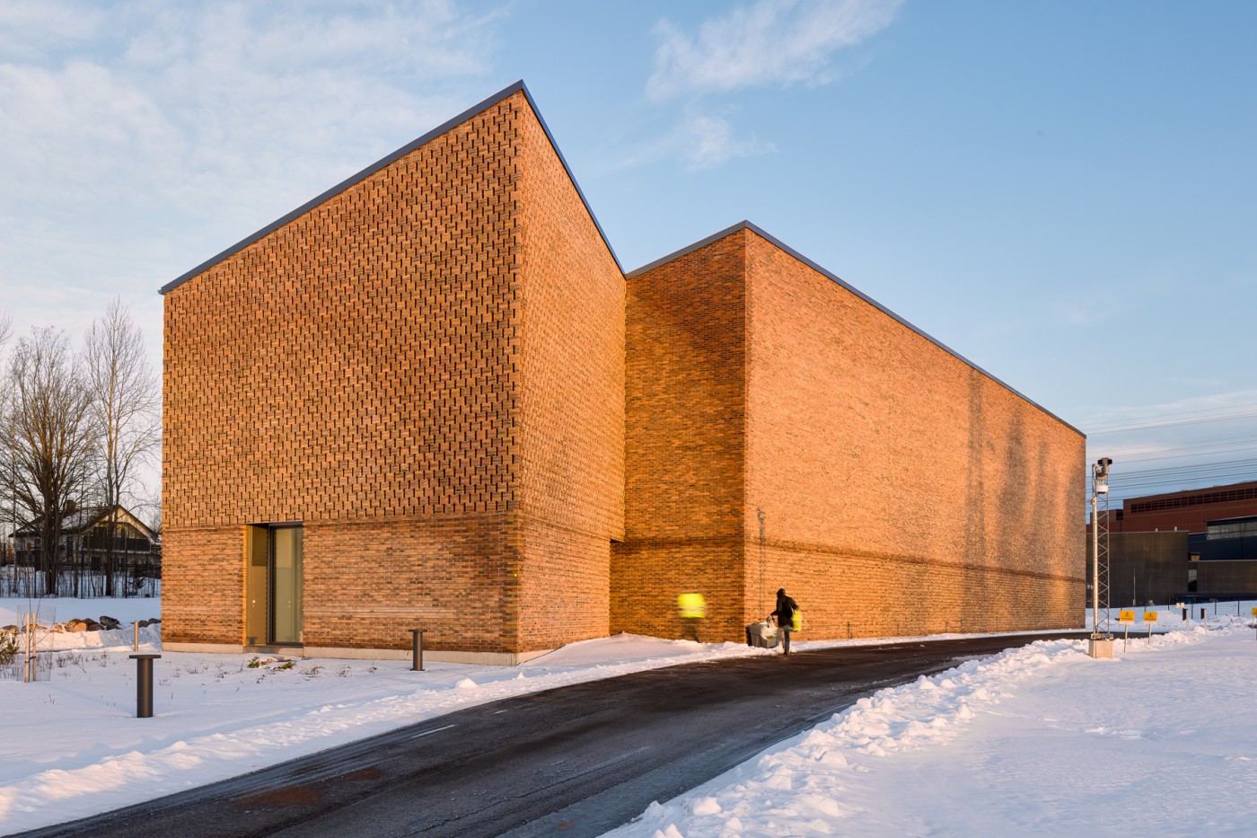 The project comprises a 110 kV switchgear building, a standby power container, landscaping, and new transmission line structures. The oldest building on the site is a former substation building designed by architect Aarne Ervi in 1947, consisting of a low, long volume terminating in a tall tower. Similarly, the architecture of the new switchgear building is based on the division of the mass into different blocks. In addition, the steeply pitched roof and the red and orange brick cladding of the facades tie the new building to the shape and colour of the old building.