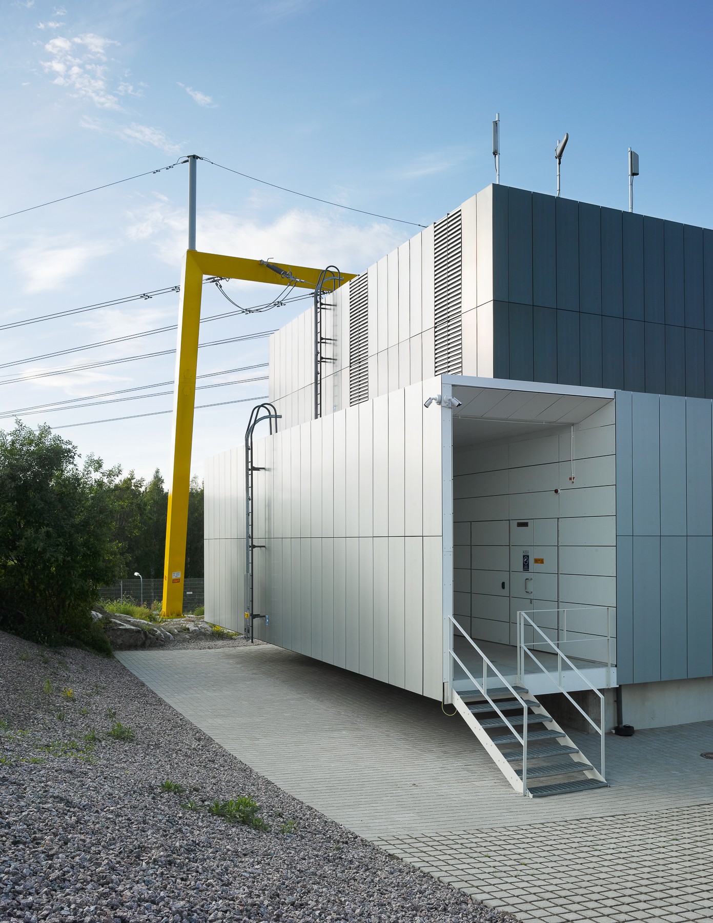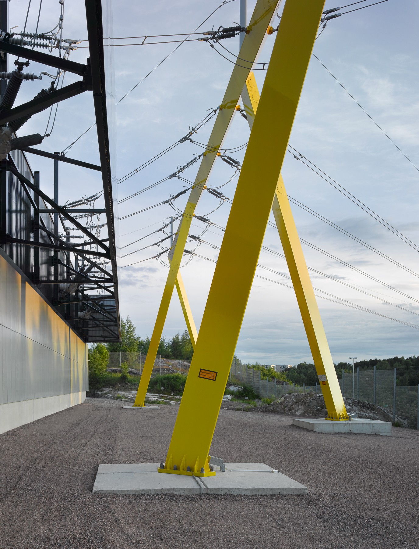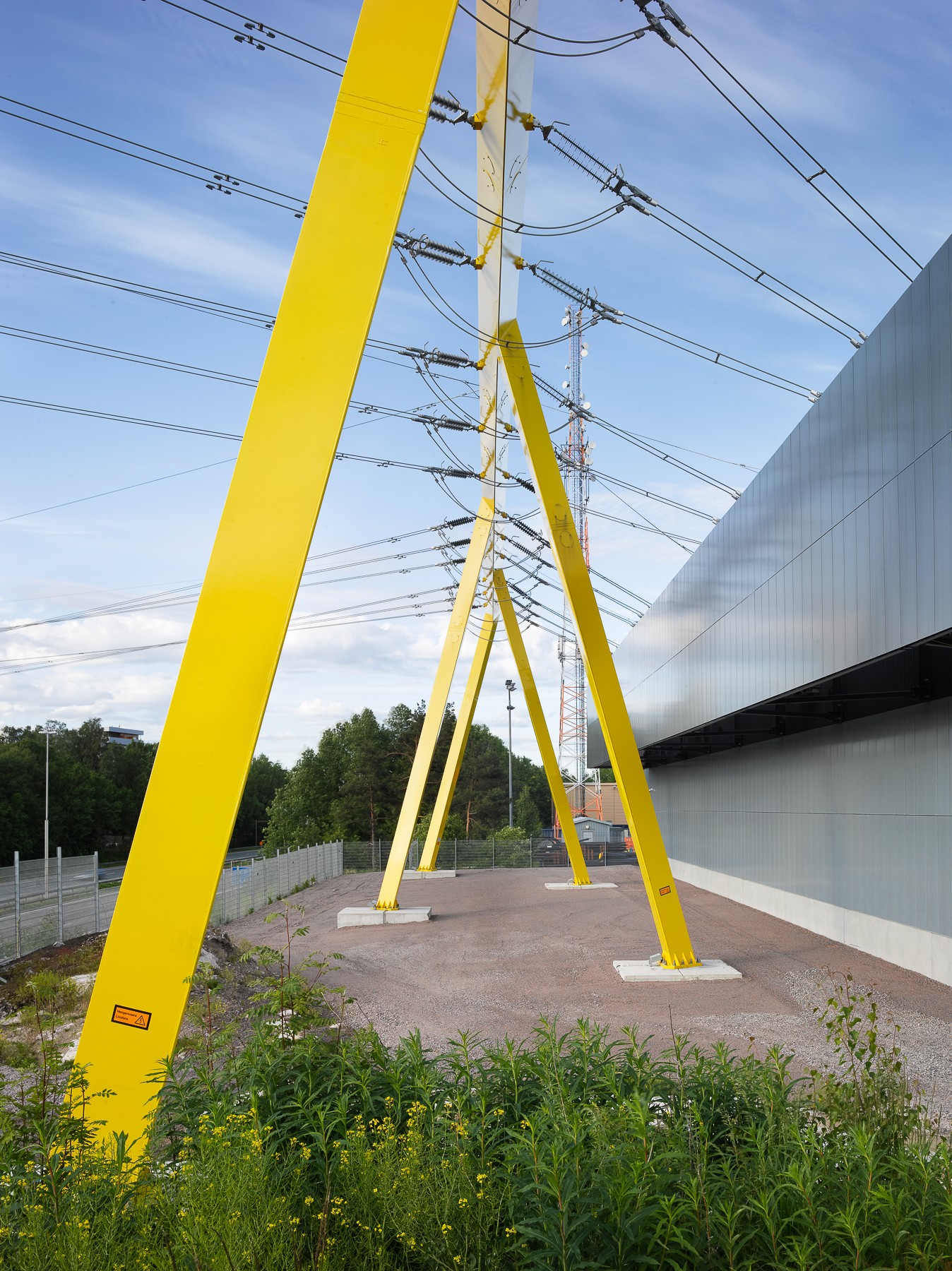 In the Viikinmäki substation project, an indoor gas-insulated switchgear replaced an old open switchyard. The award-winning substation is located prominently along the busy Hämeentie road, consisting of a yellow landscape portal and the substation building. The high-quality architecture and construction and the design of the transmission line structure take into account the visible building site and the surrounding landscape.